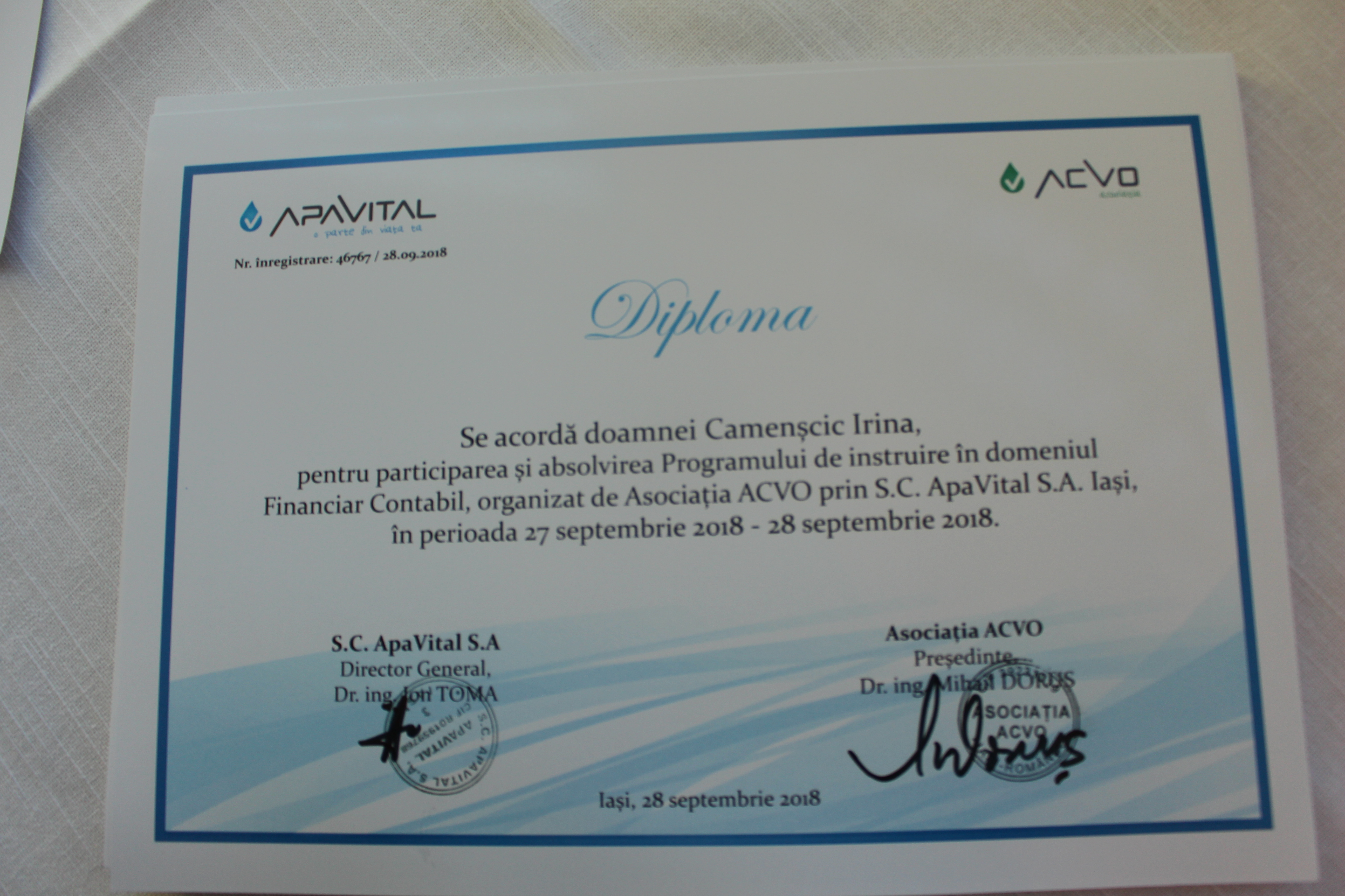 În perioada 26-28 septembrie 2018, la Centrul de Formare Profesională, din cadrul operatorului SC APAVITAL SA, orașul Iași, România a fost organizat schimbul de experiență în domeniul financiar contabil, la care au participat 49 persoane, specialiști contabili și economiști din cadrul întreprinderilor de alimentare cu apă și de canalizare membre AMAC.