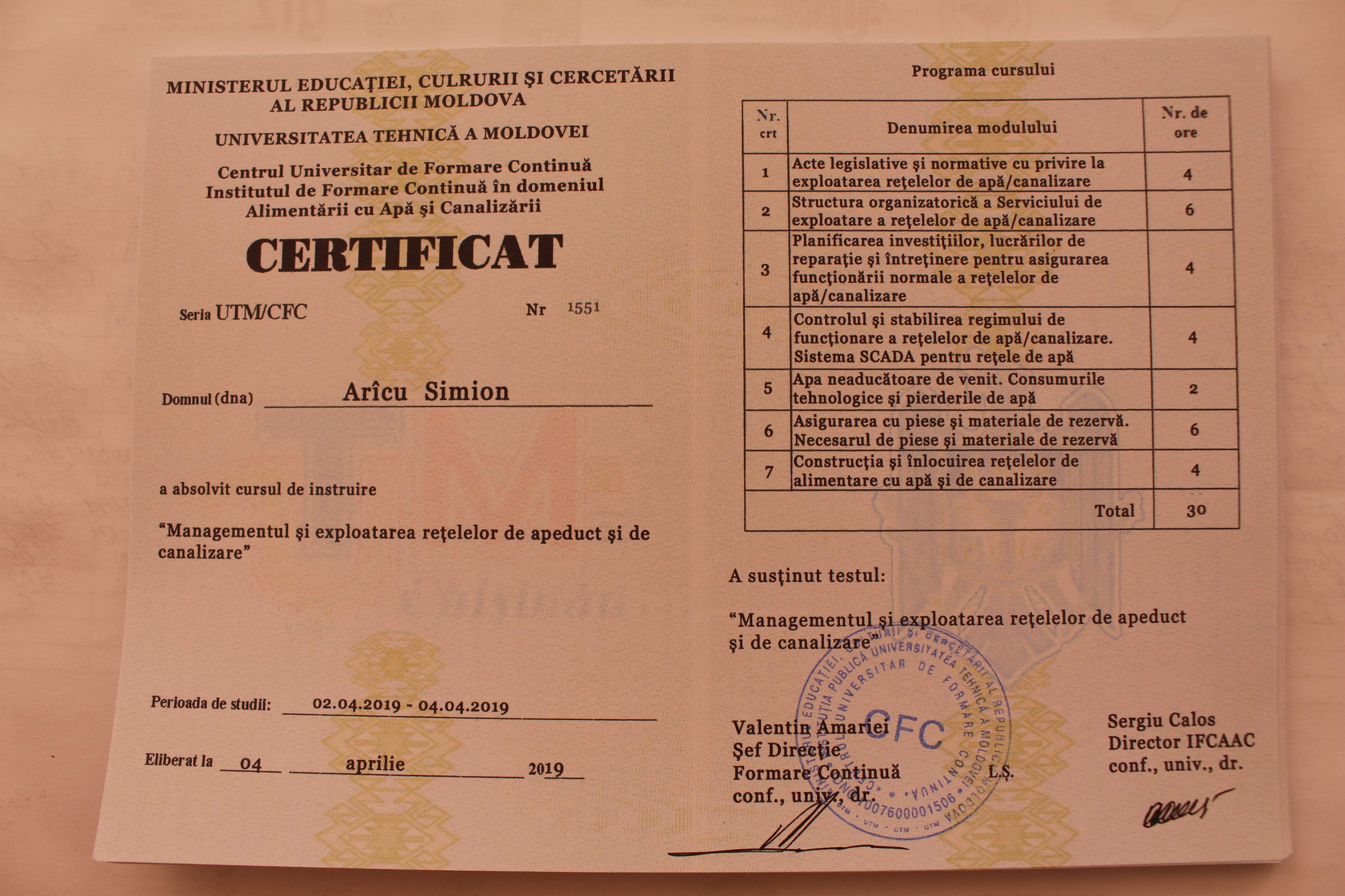 Prima pagină   »  Institutul de formare continuie   »  INSTRUIRI » Cursul de instruire pentru Modulul: ” Managementul și exploatarea rețelelor de apeduct și de canalizare.” Grupul 1 (limba română)